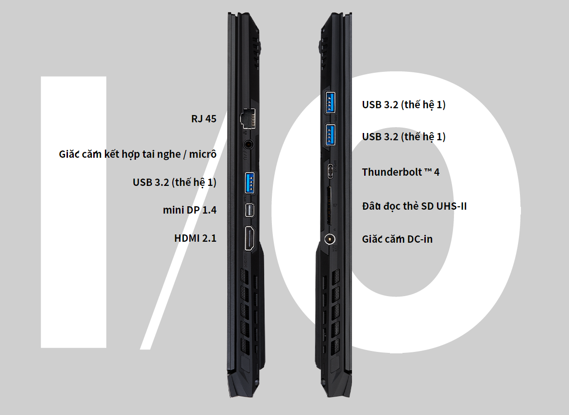 Truyền dữ liệu và hiển thị video với cổng Intel Thunderbolt 4, cho tốc độ truyền lên đến 40Gbps và nhanh hơn gấp 8 lần so với USB 3.1. Cổng HDMI 2.1 hỗ trợ xuất hình ảnh lên đến 4K 120Hz, tạo một hệ thống đa màn hình độc đáo với Laptop Gaming AERO. |